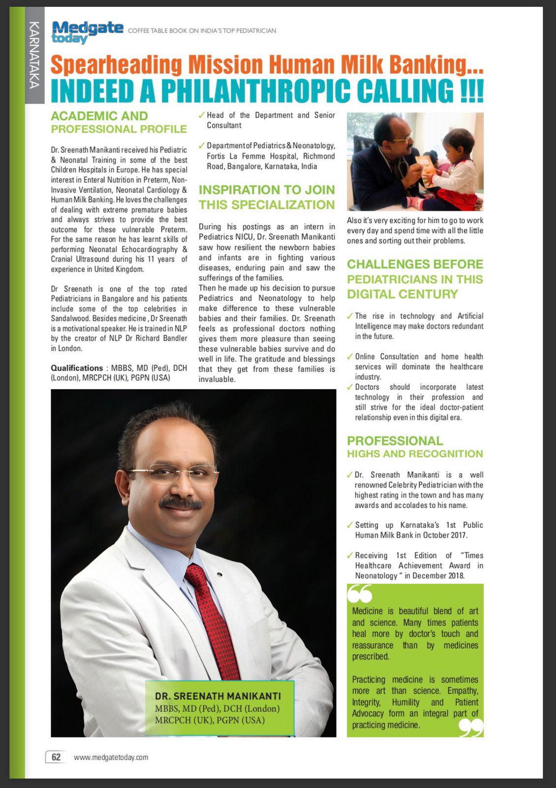 Dr. Sreenath Manikanti, who is a Senior Consultant Pediatrician and Neonatologist at Fortis Lafemme Hospital, Richmond Road, Bangalore. Growing Up Children's Clinic provides quality services like all childhood vaccinations including painless vaccines, nebulizations, growth monitoring, developmental assessment apart from taking care of sick children. Dr. Sreenath has over 25 years of experience in child care and has been trained in the United Kingdom from 2003 to 2014 in Paediatrics and Neonatology. He worked in some of the premier children hospitals in Europe and carries with him vast experience in dealing with sick children and newborn. He has featured in numerous TV shows and interviews, written numerous articles in English and Kannada dailies. He is very popular with his patients and maintains highest stand of care and professionalism. He has received numerous awards including 1st Edition of prestigious Times Healthcare Achievement Award . He has also featured in India's Top 25 Paediatricians -Coffee Table Book